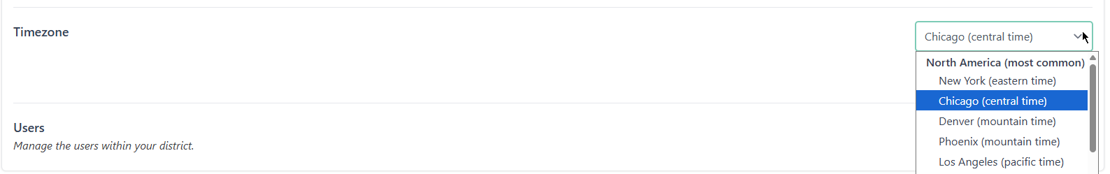 To update the timezone from the default of New York (eastern time), you can go to the District Settings Page and find the section for Timezone. Use the dropdown menu to adjust the setting, then click submit.