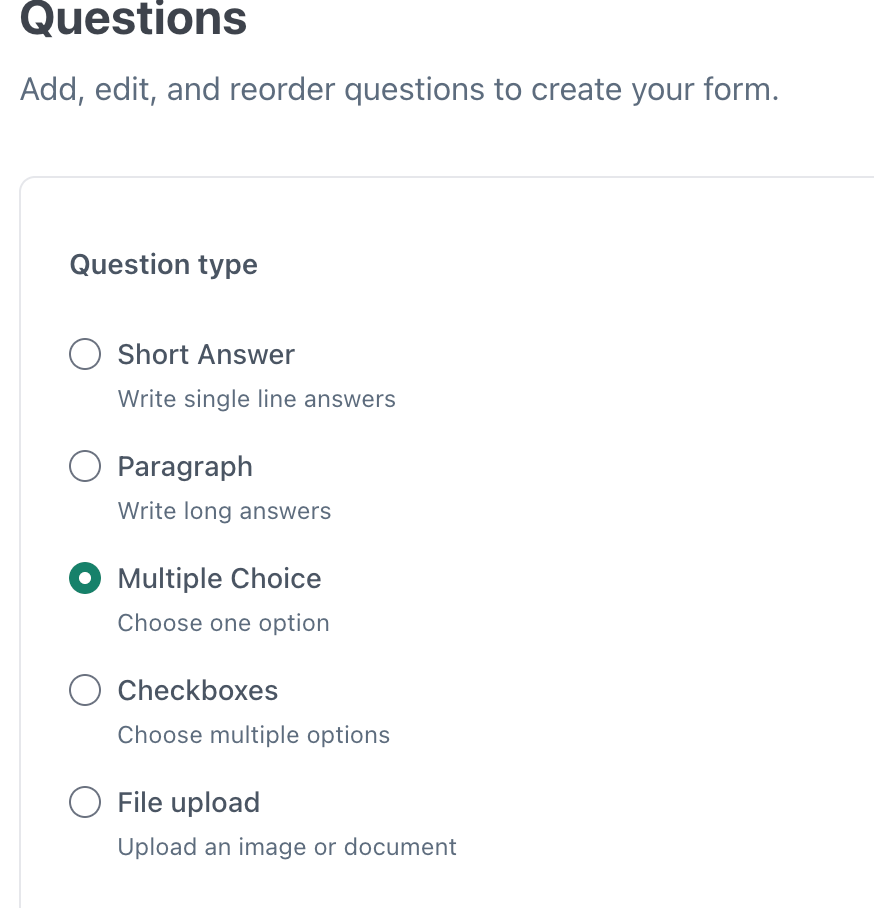 Add as many questions as you need using short answer, paragraph, multiple choice, checkboxes, and file upload questions!