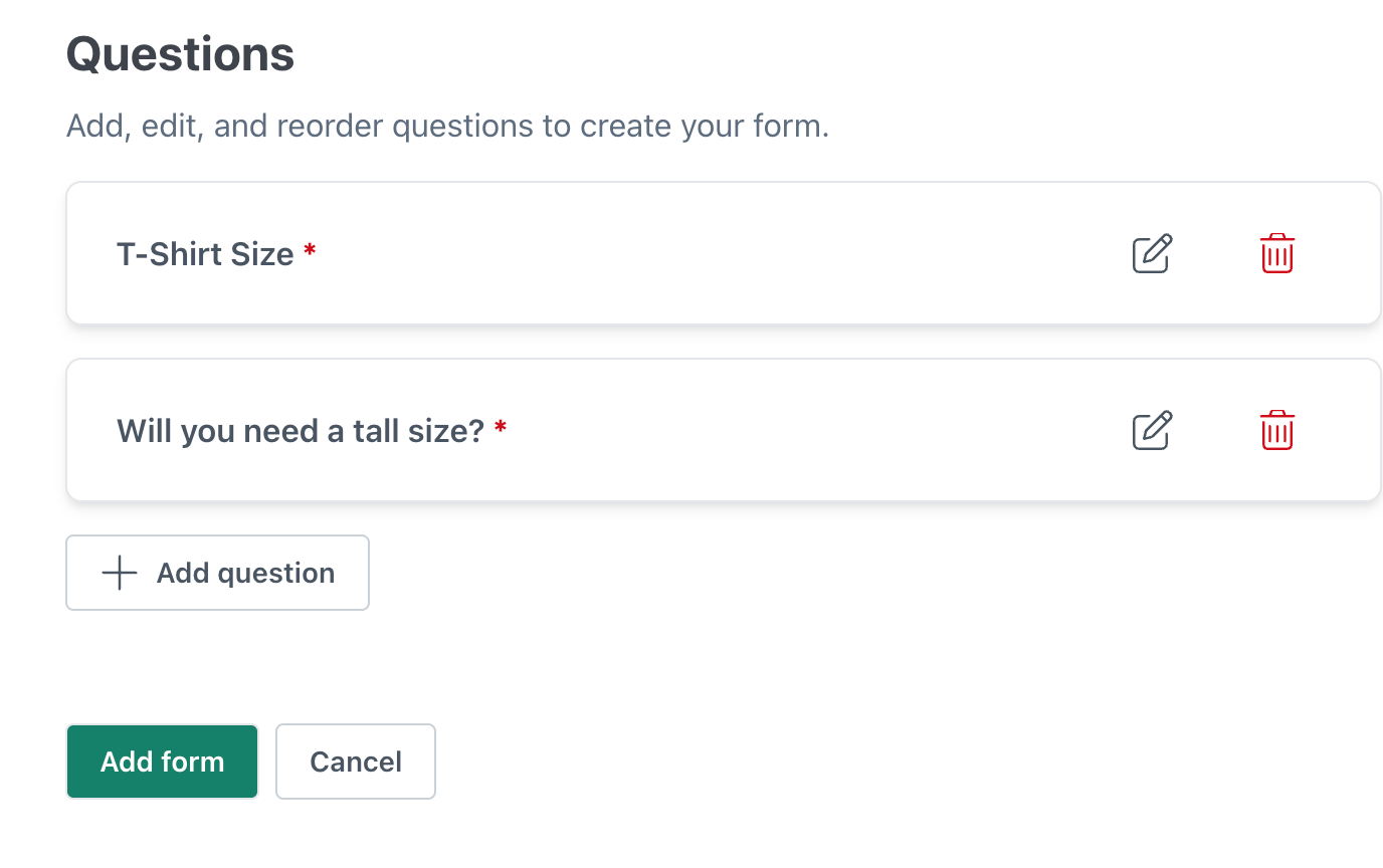 If you need to Edit or Delete a question you have added, you can do so before completing this form setup by clicking either the pencil or trash icons.