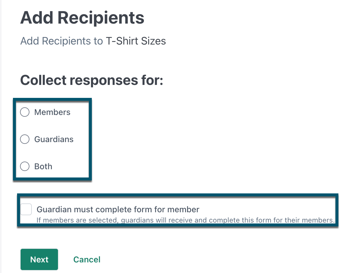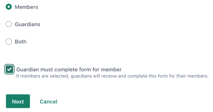 Select members, guardians, or both. If this is a form that should only be answered by a guardian or by a guardian on behalf of a member, check that box. Then click next.