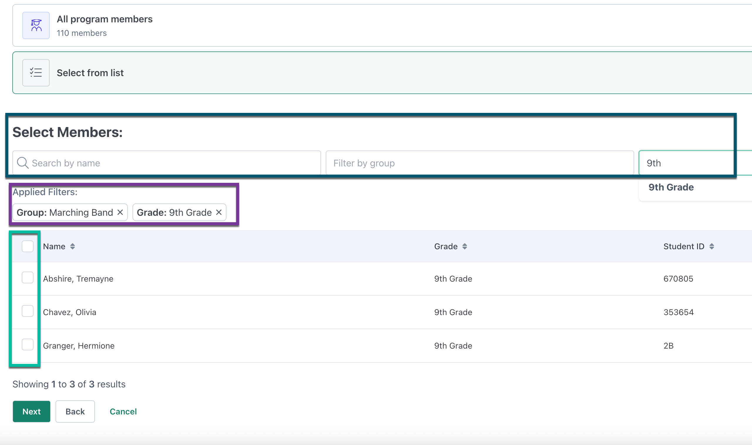 If you choose to select from a list, you will see the list of active members, where you can filter for a name, Group, (or Grade Level for students/members). Select them by using the checkboxes.
