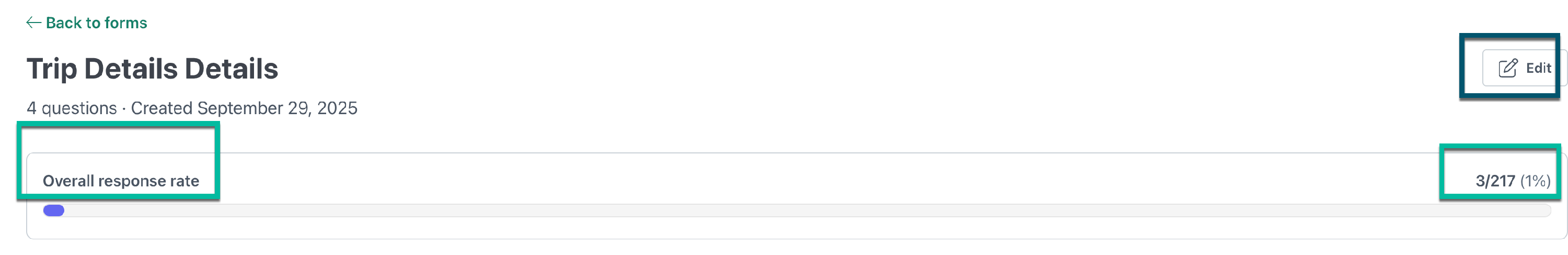 Once you have sent out your forms, your page will refresh to the details page for this form. At the top will be an overview of how many questions are in this form and the creation date, as well as an overall response rate percentage.