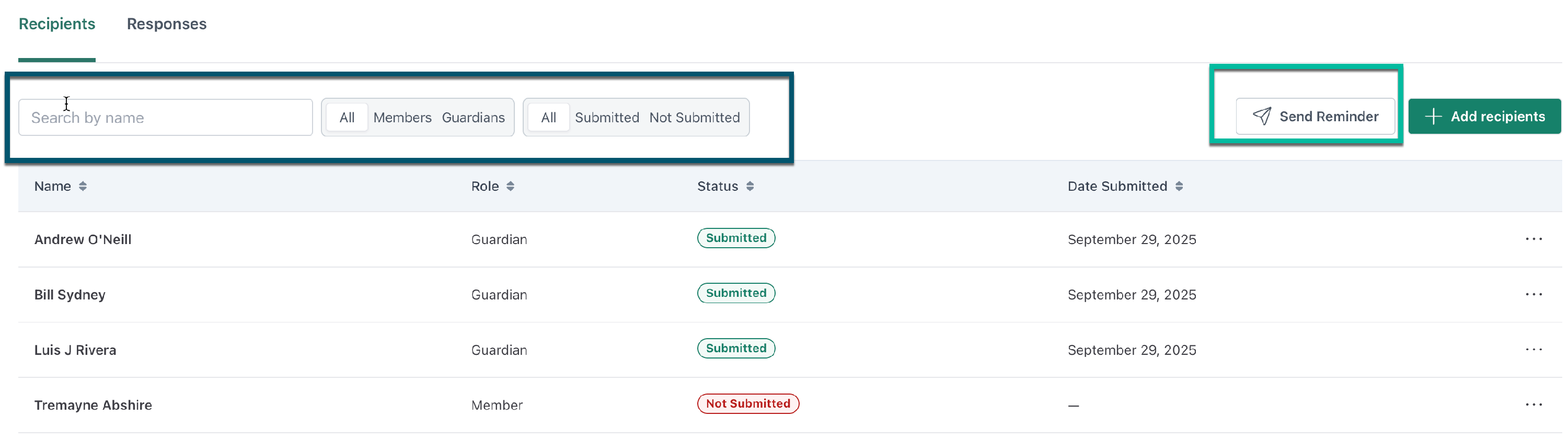 The Recipients tab will show you the current status and/or the date they submitted their responses. Each column can be sorted, and you can easily find a recipient by using the filters at the top.