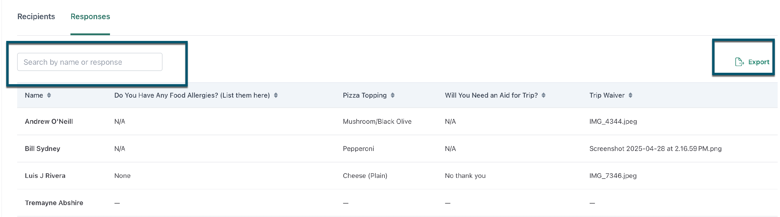 The Responses tab will show you more details on per recipient. You can use the filter search by at the top to find a name or a specific response. If they have uploaded a file, you can click through on that file to view it.