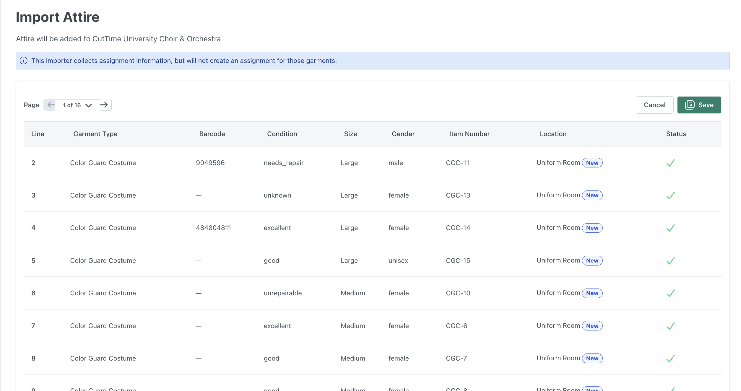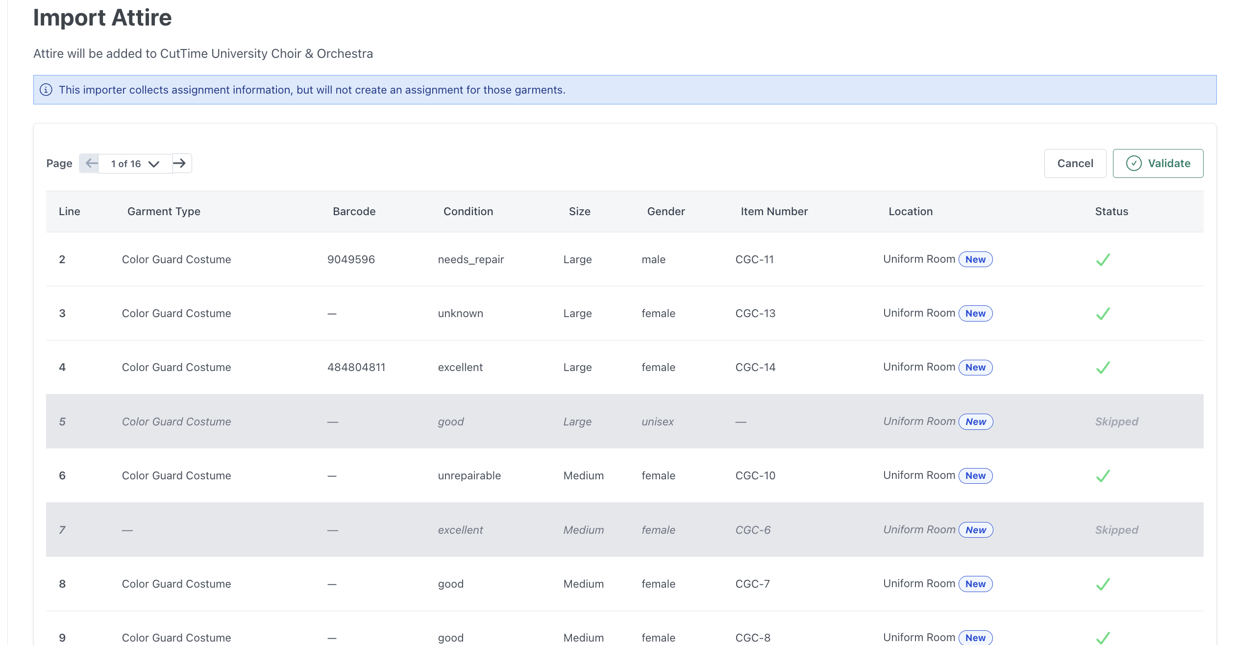 Once you click the green "Validate and import" button, you're done! Any records that were not skipped will now appear in your Attire page.