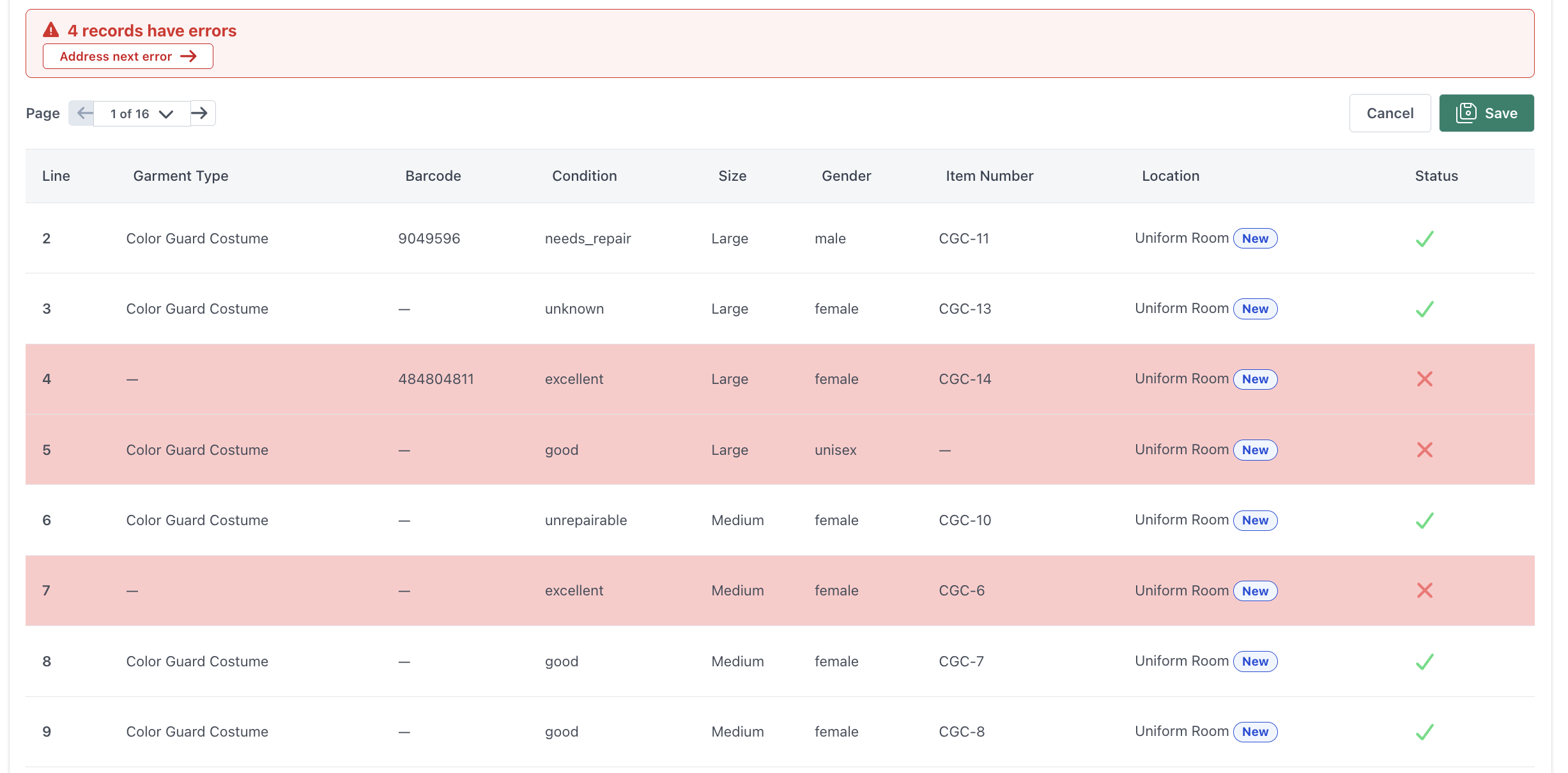 Once all attire records have been reviewed, click the green Validate button. Any records containing errors will be highlighted in red, and the total number of errors will be displayed at the top of your screen.