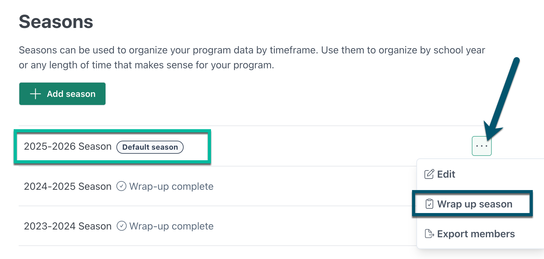 - Set up your next season by adding a new one or selecting from your existing seasons. The system will import relevant data from your current season into the next season for you.