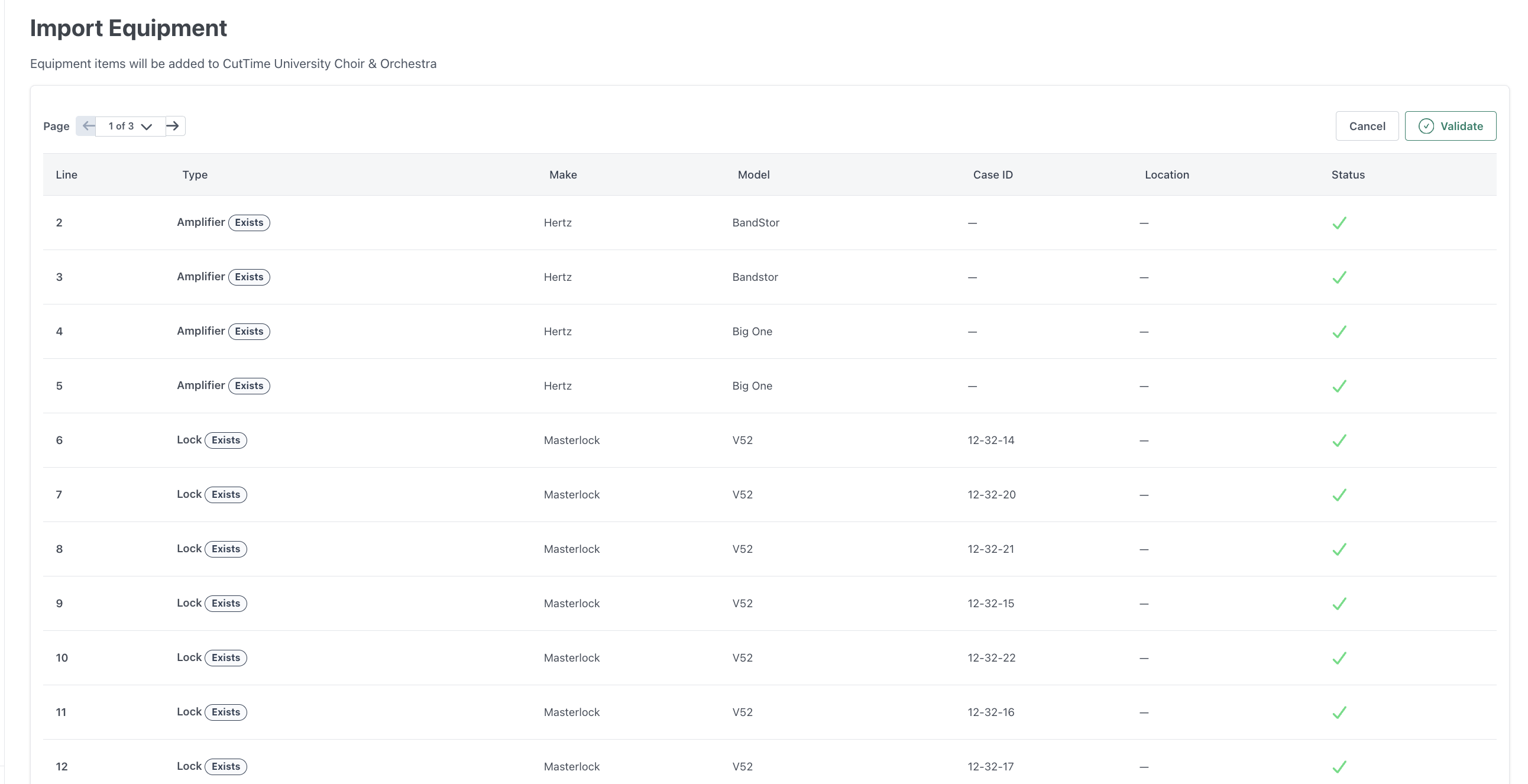 When you have verified all of your equipment records, click the green "Validate" button on the top right of your screen to finalize the import. If the button is greyed out, that means you have at least one invalid record that must be either edited or skipped before the import can be finalized - check for any rows that are highlighted red.