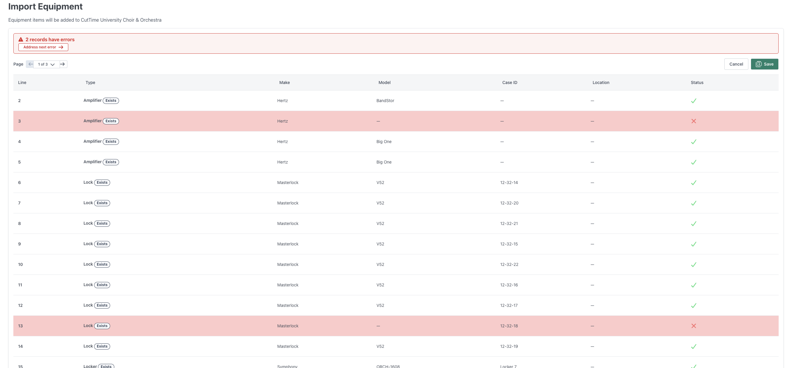 - If you'd like to exclude an equipment item from the import, you can click "Skip row" instead. Skipped records can also be un-skipped. See above for more information about skipped records.