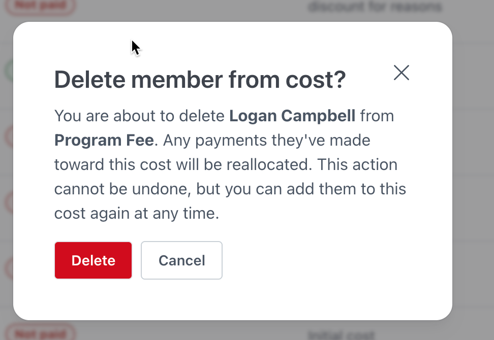 - Click "Delete". A popup will appear for you that will give you more information about what will happen when you remove this person from the Cost: