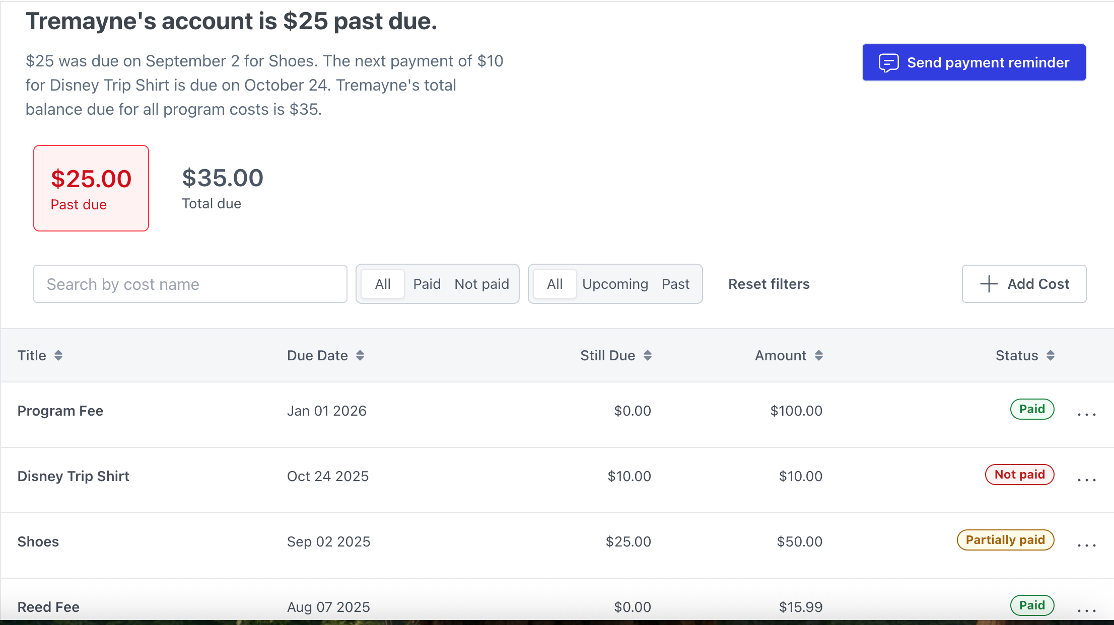 - Later, a User sets up a new Cost; "Instrument Rental Fee" due June 26th ($25).