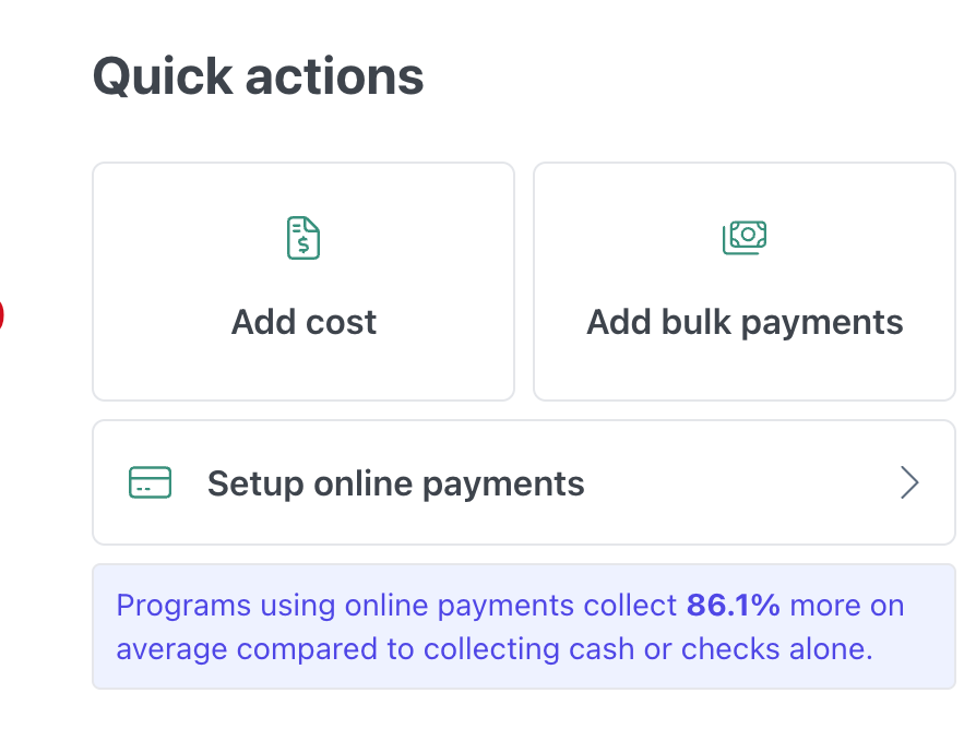 These buttons allow you to quickly add a cost or payment, and to setup a payment processor for online payment collection or edit your payment processor that you currently have connected.