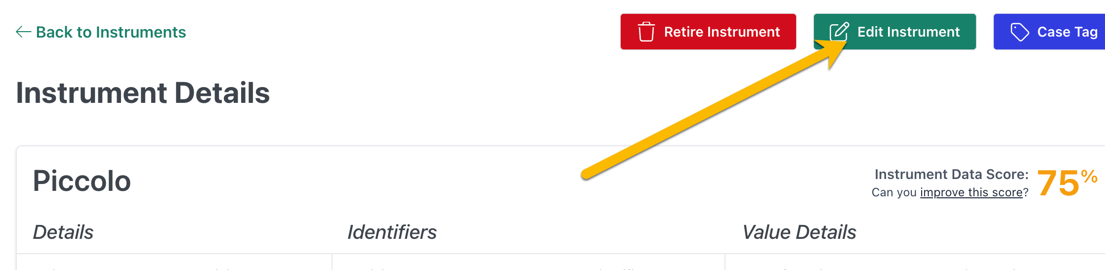 Click through on an Instrument's details page to fin the "Edit Instrument" button on the top right.