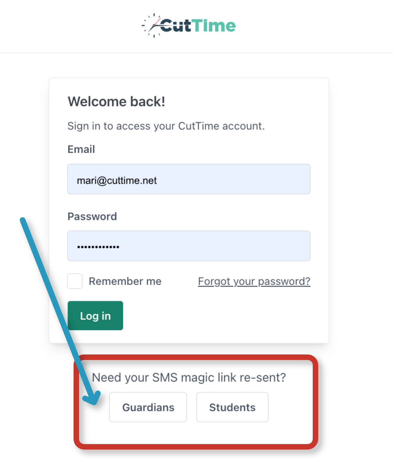 If at any time a parent or guardian cannot locate their magic link in their email or text messages, they may visit https://app.gocuttime.com/login and select either “Guardian” or “Student.” From there, they can enter the email address or cell phone number associated with their CutTime account to have a new magic link sent to them.